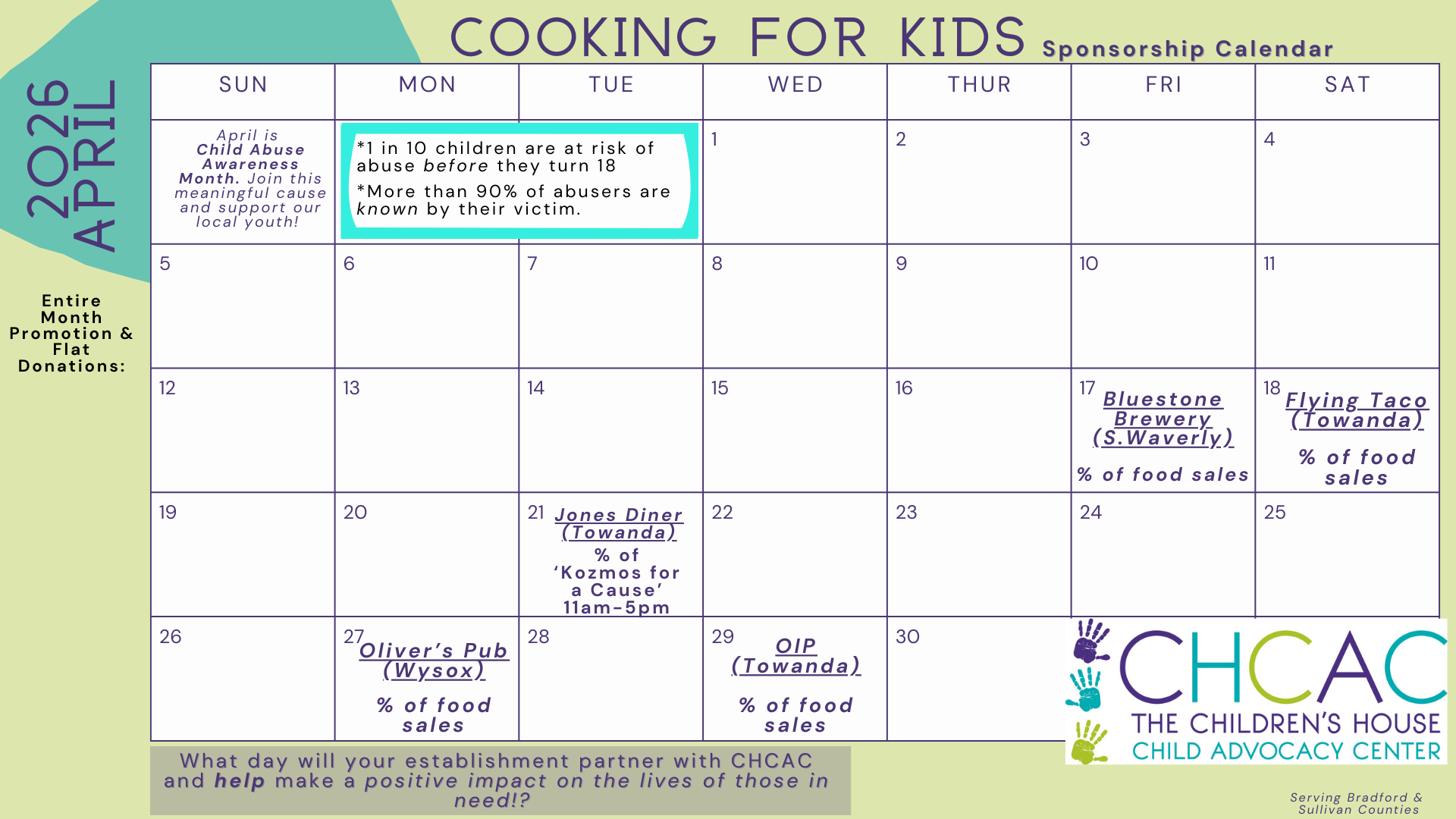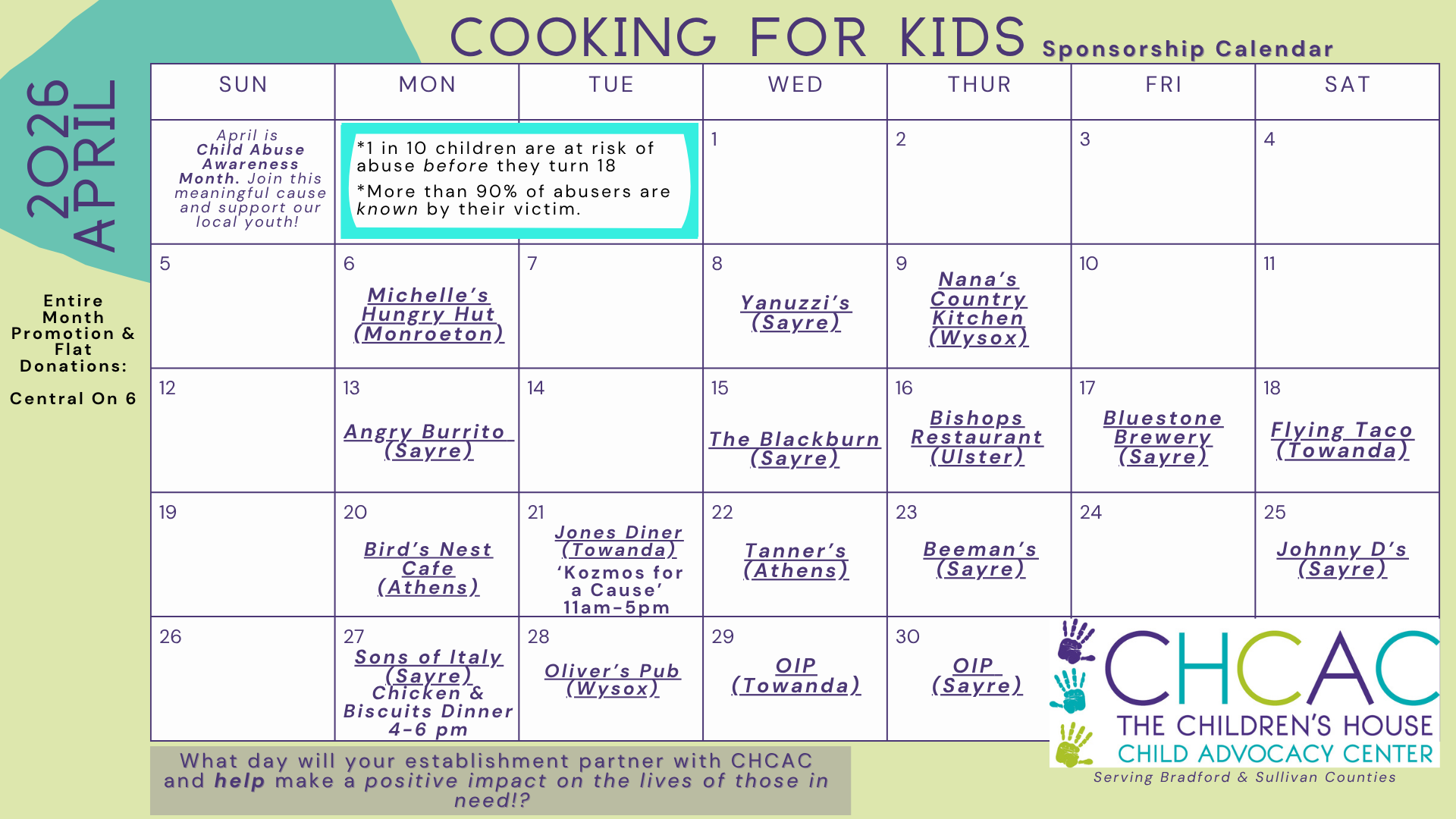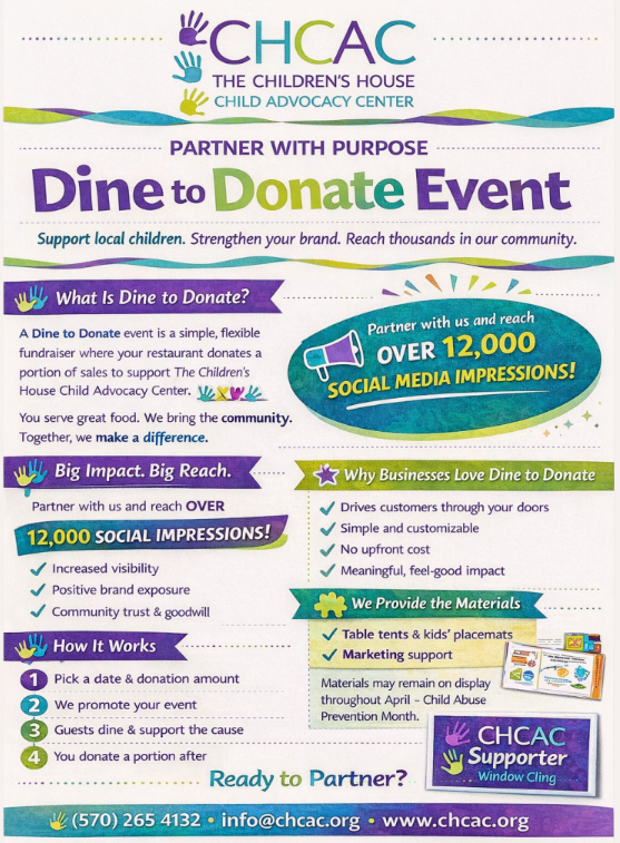 During Child Abuse Prevention Month, local restaurants across Bradford & Sullivan Counties are partnering with The Children’s House to turn dining out into meaningful impact. When you eat at a participating location, a portion of the proceeds directly supports children and families navigating abuse and trauma.